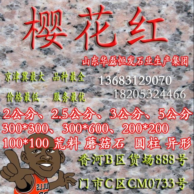 山東華磊恒發(fā)石業(yè)始建于1999年,擁有白麻礦山,櫻花紅礦山,先進(jìn)的機(jī)器設(shè)備,近年又投資乳山灰礦山,年加工石材5000立方,產(chǎn)品出口歐美日韓。公司宗旨,以質(zhì)量求生存,歡迎新老客戶光臨指導(dǎo)。
