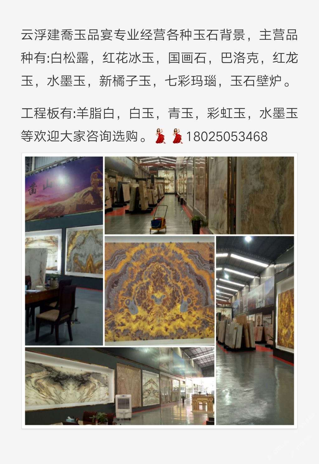 本公司有現(xiàn)貨各類精品高檔玉石背景墻。圖案精美,品種多樣,各種大小尺寸拼圖,板材足足1.8厚。歡迎來(lái)電咨詢!