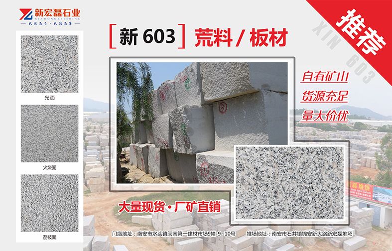 新宏磊石業(yè)有限公司自有礦山,荒料堆場50余畝,有花崗巖和大理石加工廠,是集礦山開采、板材生產(chǎn)加工、銷售出口為一體的綜合性石材供應(yīng)商,在石材行業(yè)已經(jīng)擁有10年以上的生產(chǎn)與銷售經(jīng)驗。