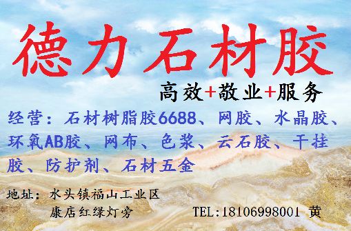 經(jīng)營(yíng)范圍:石材樹(shù)脂膠,透明膠,水晶膠,工藝樹(shù)脂膠,薄板復(fù)合膠,防水背膠,臺(tái)灣AB膠,網(wǎng)布,色漿,防護(hù)劑,意大利進(jìn)口水性AB膠,云石膠,干掛膠,石材色差處理,外墻清洗