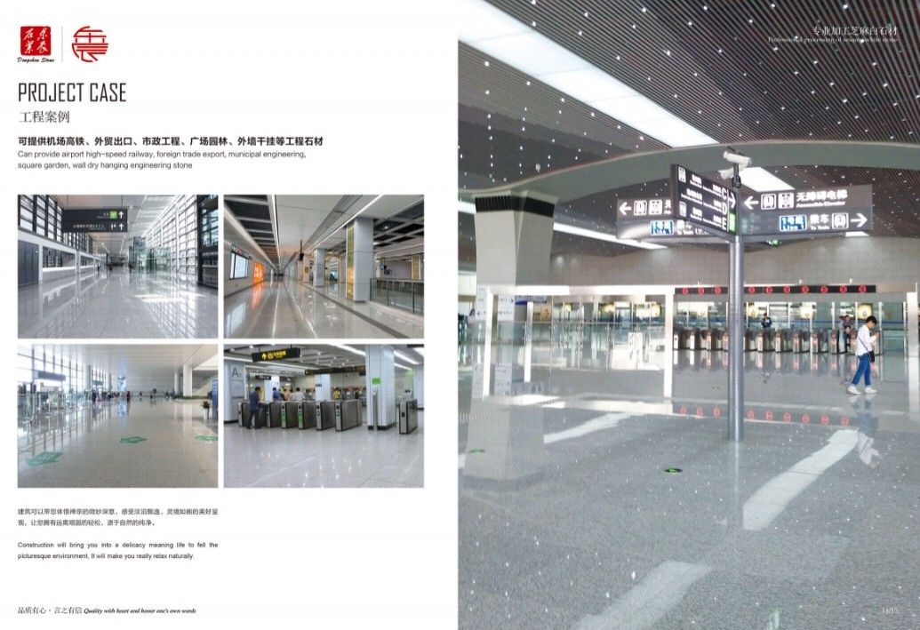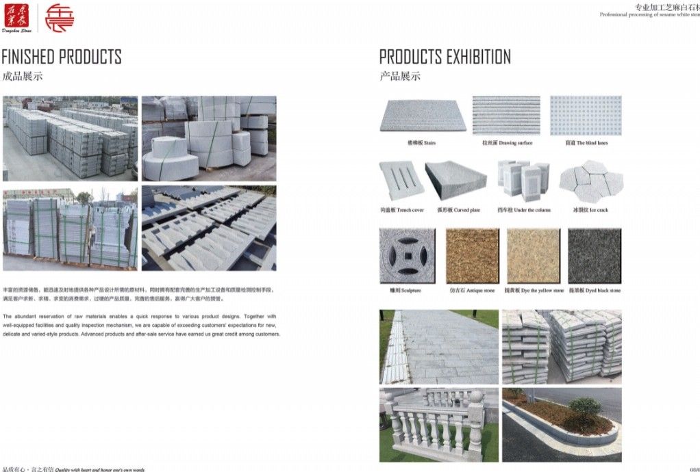 主營:承接高鐵機(jī)場(chǎng)、外墻干掛、廣場(chǎng)別墅、市政工程和外貿(mào)出口等各種工程板。 主營芝麻白G603、芙蓉白G602火燒面、光面、荔枝面、斧剁面、噴砂面、拉絲面、菠蘿面,水溝蓋板、雕刻板、路沿石、蘑菇石、擋車石、馬蹄石、冰裂紋、圓球、染色板等