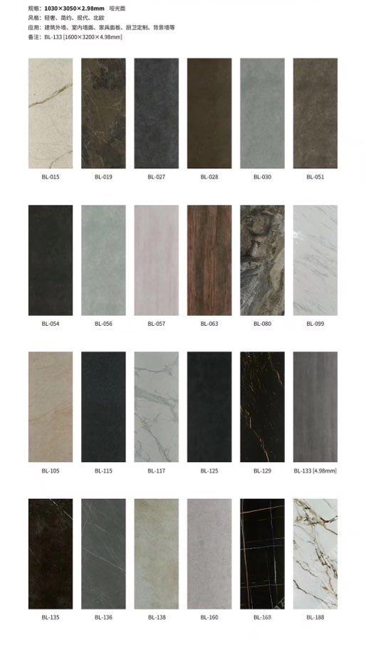 發(fā)布信息: ????SIBELAN 斯貝納巖板???? ????意大利設(shè)計(jì)師精選巖板???? 我們可以幫老總您加工為成品, 全國范圍內(nèi)可安排專業(yè)團(tuán)隊(duì)安裝. 做到您一次性采購 省心. 放心. 省時(shí). 低價(jià)! 巖板紋路版面全多達(dá)199 款 勵(lì)志做服務(wù)五星的巖板專業(yè)供應(yīng)商 魚肚白 雪花白 格蘭云天 寒江雪 爵士白 幻影灰 勞倫黑金 火山灰 亞馬遜 艾維拉 羅馬黑檀 貝特巖 細(xì)花白 羅馬灰 云朵拉灰 魚肚金 莎羅娜 莎羅蘭 勞倫白金 拉薩白 中花白 灰冰玉 卡拉拉白 撒金黑 清水玉 薩瓦灰 莎士比亞 大花灰 白冰玉 銀灰洞 阿瑪尼灰 綠紋玉 綠冰玉 藍(lán)紋玉 保加利亞灰 鐵銹 黑木紋 流砂灰 純白 純灰 純黑 TEL: 15905069590 聶 各種版面規(guī)格全部如下: 1200×600×11mm 啞光 1500×800×11mm 啞光 1800×900×11mm 啞光 1800×900×12mm 啞光 2600×800×15mm 啞光 2400×1200×6mm 啞光/亮光 2400×1200×9mm 啞光/亮光 2400×1200×15mm 啞光 2700×1200×6mm 啞光/亮光 2700×1600×12mm 啞光/亮光 3200×1600×6mm 啞光/亮光 3200×1600×12mm 啞光/亮光