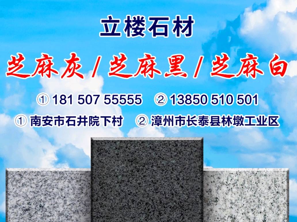 發(fā)布信息: 【立樓石材】廠家直銷,價(jià)格優(yōu)惠[強(qiáng)]? 主營【芝麻黑,芝麻灰】 ※誠信為本,保質(zhì)保量※ 精品.專注:園林景觀工程,墓碑、干掛板、地鋪石、路沿石、規(guī)格板、蘑菇石、馬蹄石。 各種異形加工、光面、火燒面、荔枝面、自然面、釜剁面、菠蘿面、水洗面、拉絲面等等。 優(yōu)質(zhì)毛板,成品板大量庫存,價(jià)格便宜,歡迎詢價(jià) 電話:181 507 55555 黃 廠址一:南安市石井鎮(zhèn)院下村 廠址二:長泰縣林墩工業(yè)區(qū)