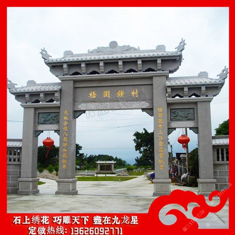 發(fā)布信息: 石牌坊制做廠家 鄉(xiāng)村牌坊大門效果圖大全賞析——九龍星石業(yè)。 鄉(xiāng)村牌坊大門效果圖具有相當(dāng)高的實(shí)用性的,從建筑的美觀上石牌坊是一個(gè)建筑的 代言,從文化上石牌坊是一個(gè)區(qū)域或一個(gè)地域或一個(gè)民族的文化修養(yǎng)代言,在使用性 上從小的來(lái)說(shuō)石牌坊可以做一個(gè)院落的大門,可以是一個(gè)街和它文化的開端。 石牌坊制做廠家在制作上其用料的選擇是非常講究的,在雕刻制作時(shí)也是要 求的比較的精致。而且美麗鄉(xiāng)村入口牌坊上都混雕刻有圖案和文字有著深厚的文化以 及當(dāng)?shù)氐拿耧L(fēng)民俗。在村指引牌坊圖片的制作過(guò)程中,每一座石牌坊都會(huì)采用陰刻、 線刻、浮雕、鏤雕、雙面雕等多種不同的雕刻手法,使新農(nóng)村石牌坊在雕刻制作上的 圖案更加的生動(dòng)。 鄉(xiāng)村牌坊大門在主題外觀和內(nèi)容雕刻上本身就是一種藝術(shù)的詮釋。比如在門樓 四個(gè)柱腳上制作瑞獸例如:麒麟、貔貅、瑞獅、瑞象、抱鼓等傳統(tǒng)的祥瑞圓雕雕刻。 也可以和諧的添加一些西方建筑經(jīng)典,在建筑藝術(shù)上它是不分界限的,我們?cè)诿利愢l(xiāng) 村入口牌坊外觀的設(shè)計(jì)制作上,可以有一些和諧的改造也是體現(xiàn)提倡建造者的文化修 養(yǎng)的表現(xiàn)。