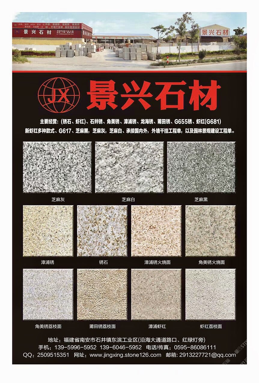 南安市石井景興石材廠 聯(lián)系人:洪    139****5952 查看 139****5952 查看 主營范圍: 大板批發(fā)、花崗巖加工、 企業(yè)地址:福建泉州石井鎮(zhèn)東濱工業(yè)區(qū)(沿海大通道路口紅綠燈旁)