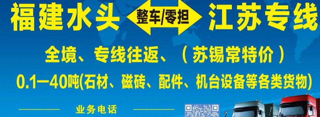 發(fā)布信息: 福建泉州水頭—江蘇全境,往返專線。 (蘇錫常特價(jià)?。?24小時(shí)在線接單 零擔(dān)~整車,0.1噸—40噸。 承接各類石材,瓷磚,機(jī)械等各類運(yùn)輸。 專注運(yùn)輸,用心服務(wù)??砷_發(fā)票。 江蘇專線15860361020。(微信同步)