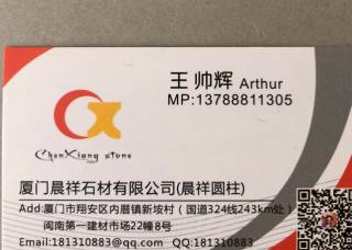 廈門晨祥石材有限公司主營(yíng)產(chǎn)品:英國(guó)白麻,云朵拉灰(onur礦),實(shí)心圓柱(大理石),欄桿花瓶柱(大理石),動(dòng)物雕刻(園林)企業(yè)地址:福建泉州南安市水頭鎮(zhèn)建材市場(chǎng)23棟6-8號(hào)